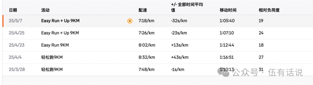 另外的一个事情,是最近我跑步得到了提升,在同路段下,配速从7:48/km提升到了7:18/km,而且通过右侧的指标能看见在速度提升的同时,负荷也在降低,说明跑得越来越快,也越来越轻松。