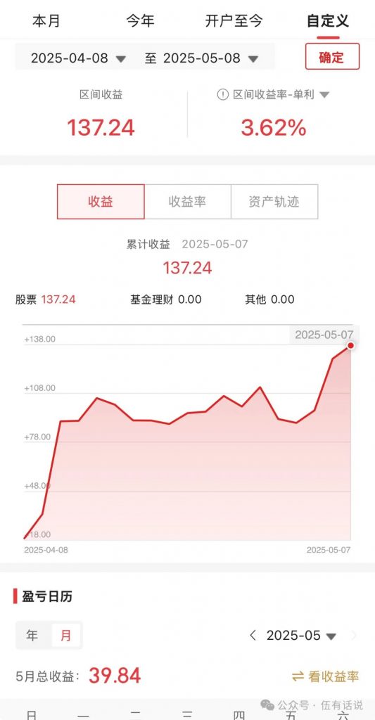 这个月收益率为3.62%,在于运气加持在于关税大战期间,正好在低位买入了几个ETF,在随后的一两天内,就开始了回撤😂。