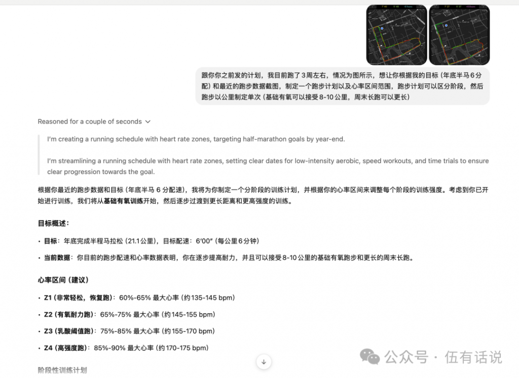 有趣的是,我的训练计划是由ChatGPT生成的,生成的时候我将我最近的跑步截图(包含数据)上传给了GPT,通过配合文字描述了我的需求以及目标,GPT就会自动生成一个训练计划,我目前跑下来觉得非常的舒服,也有较大的提升,下图是我第一次用GPT生成的跑步训练计划的部分对话,大家有兴趣的可以去尝试一下,国内使用Deekseek也可以。