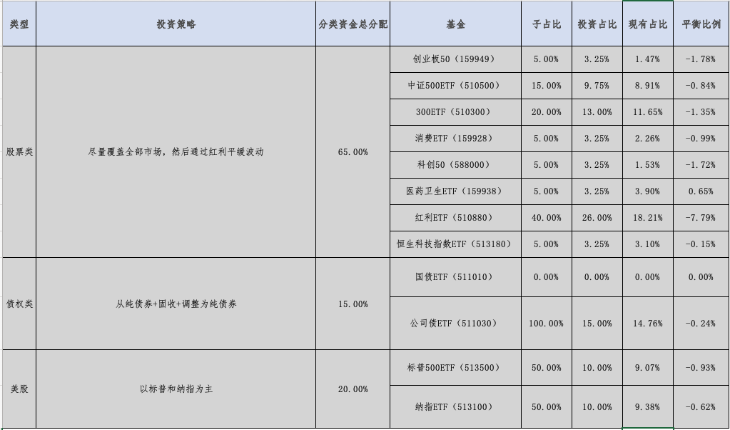 因在上月调整后,又没有太好的时间入手,所以导致组合持仓在一段时间内有较大的偏差,所以在7月31日左右,购买了纳指、标普、300ETF以及红利ETF,对整个持仓的组合进行了再平衡:
